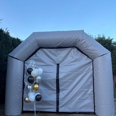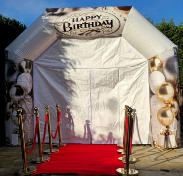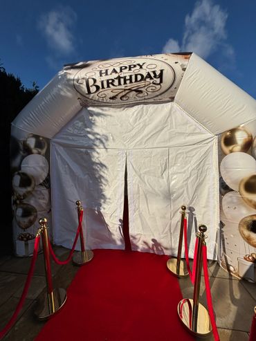 Inflatable marquee with your choice of theme on the outside and optional inside design. Disco lights, speaker, red carpet with gold bollards plus red velvet ropes and balloons all included. Inflatable chairs can be included as an optional extra.