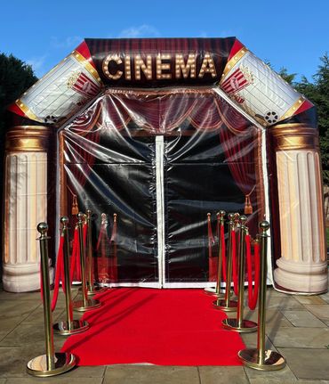 Inflatable marquee with our cinema theme on the outside and inside. Projector, speaker, inflatable chairs, floor lights inside, red carpet and gold bollards with red velvet rope or Cinema Rug or both will be provided.