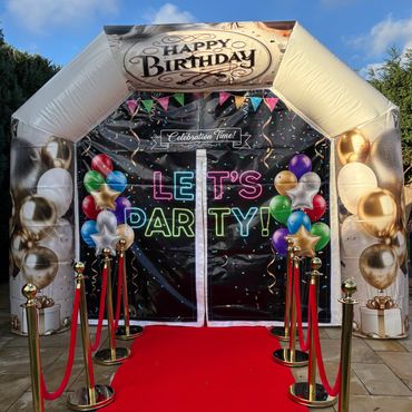 Happy Birthday Theme on the outside! This consist of the balloons and happy birthday strip across the top of the inflatable marquee. Other sections can be added such as the disco balls from the lets party theme or grey sections for example.